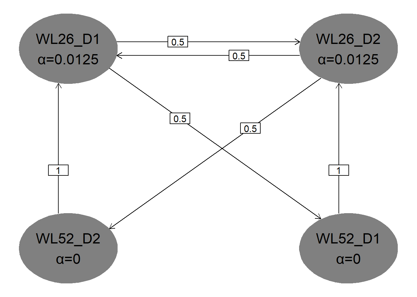 three_arm_graph_w26 <- matrix2graph(transitions, weights)